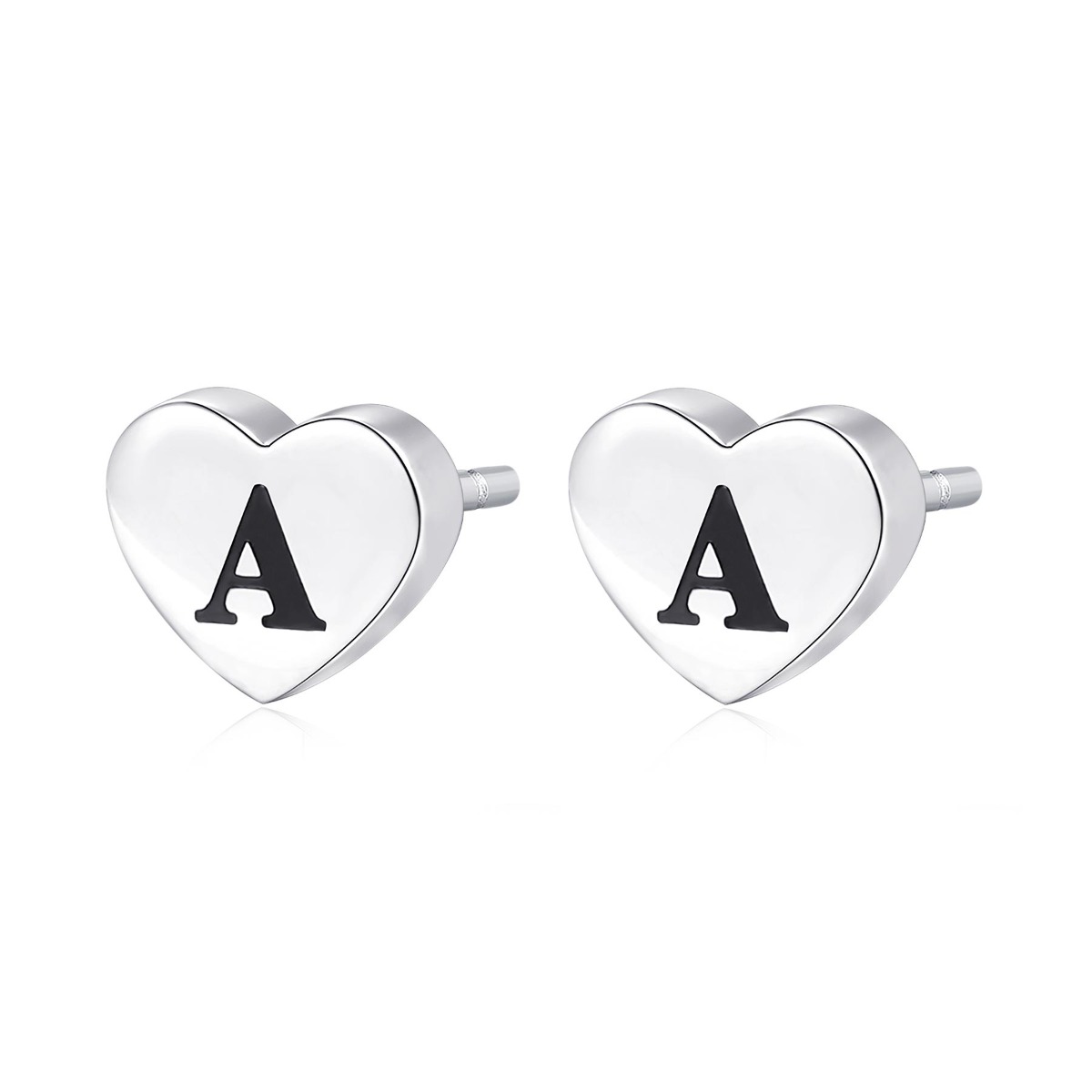 Orecchini a lobo a forma di cuore in acciaio 316L con lettera A e smalto nero.