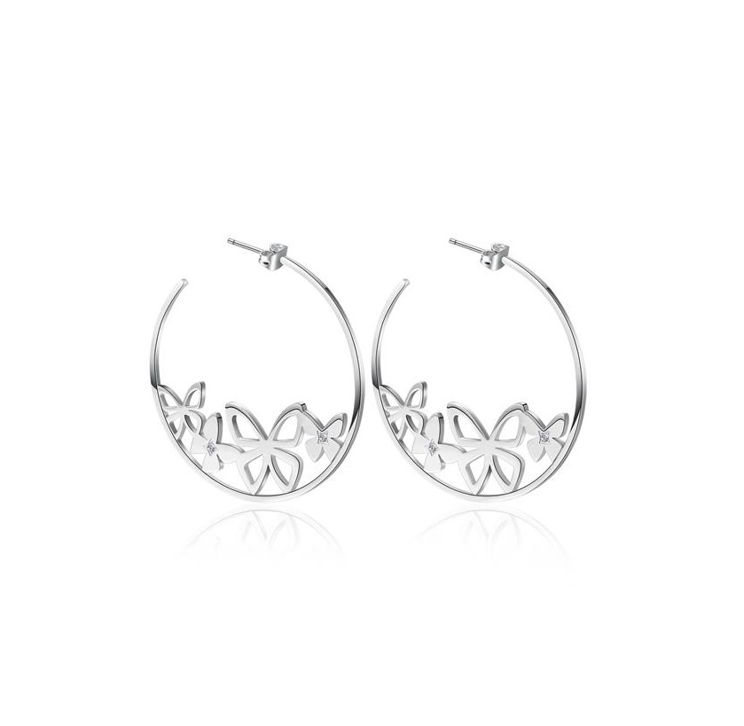 Orecchini a cerchio in acciaio 316L con farfalle e cristalli bianchi.