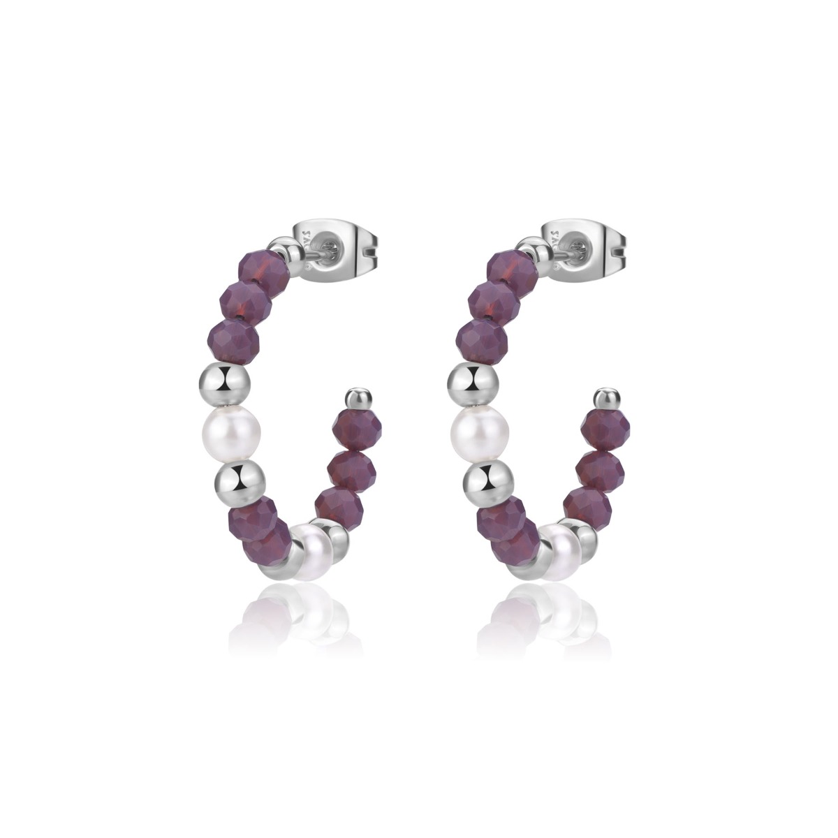 Bracciale da donna S'Agapò della collezione Glint. Orecchini a cerchio in acciaio 316L rodiato con sfere in vetro viola, acciaio 316L e perle.