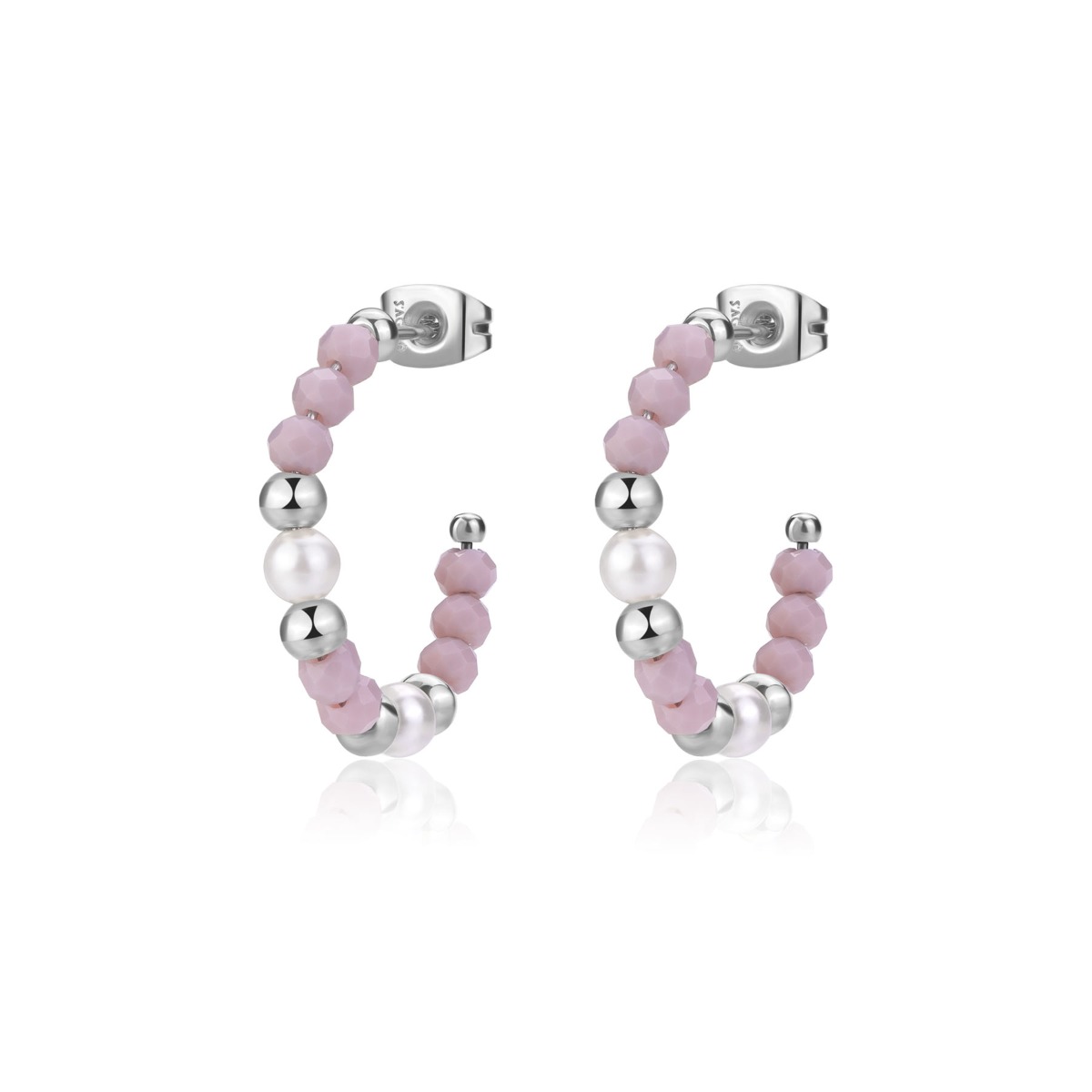 Orecchini da donna S'Agapò della collezione Glint. Orecchini a cerchio in acciaio 316L rodiato con sfere in vetro rosa, acciaio 316L e perle.