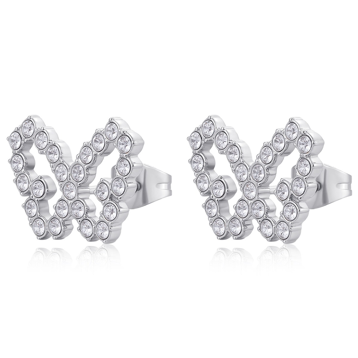 Orecchini a lobo a forma di farfalla in acciaio 316L e cristalli.