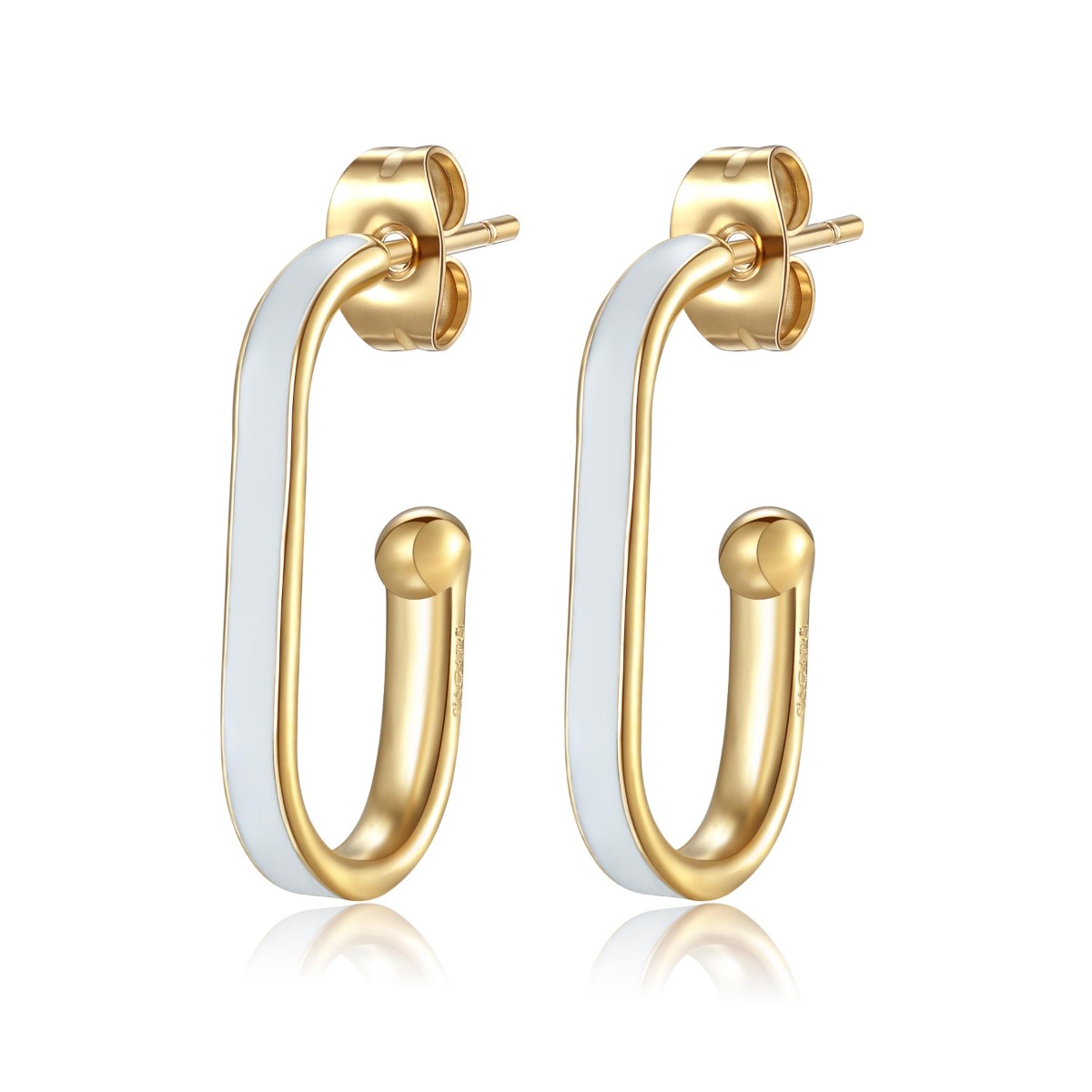 Orecchini rettangolo aperti in acciaio 316L, finitura pvd oro 14K e smalto bianco.