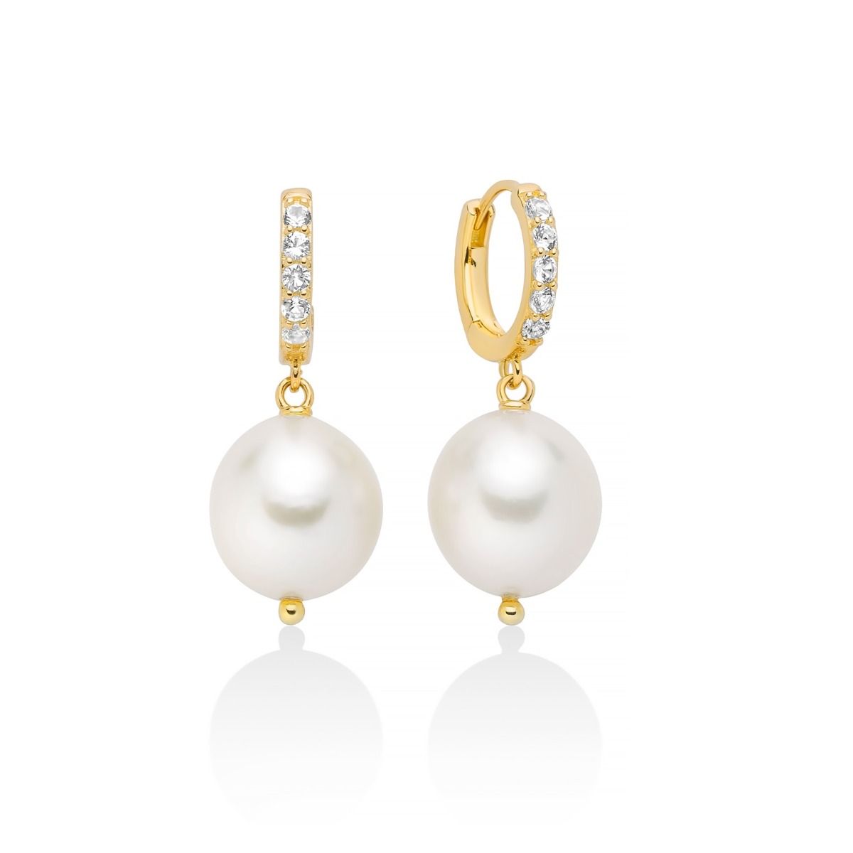 Orecchini in argento 925 Pvd oro con perle barocche 12-14 mm e topazi bianchi.