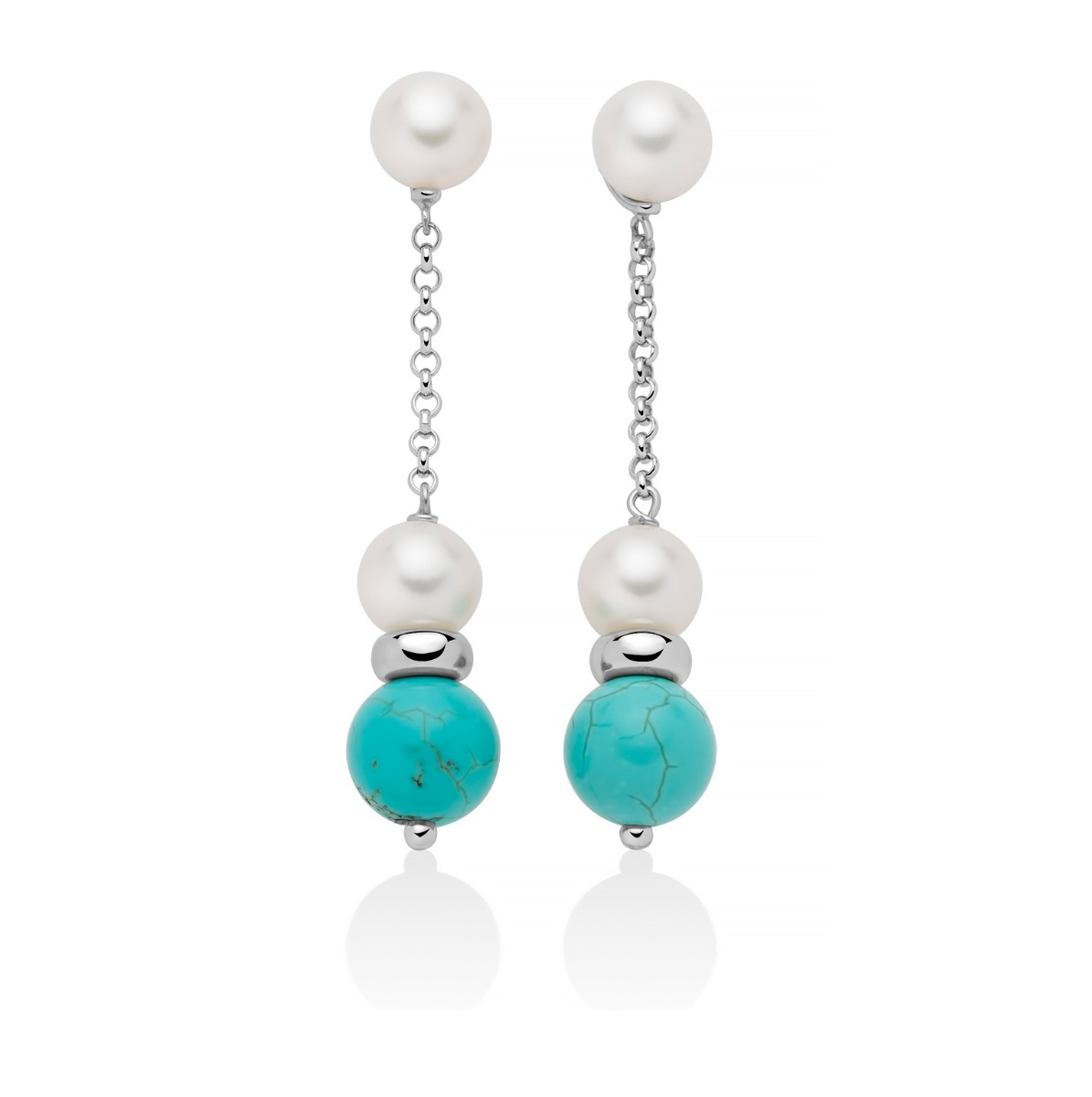 Orecchini da donna pendenti in Argento 925, 2 Sfere Aulite color Turchese da 8 mm e 4 Perle vere R da 6,5-7 mm.