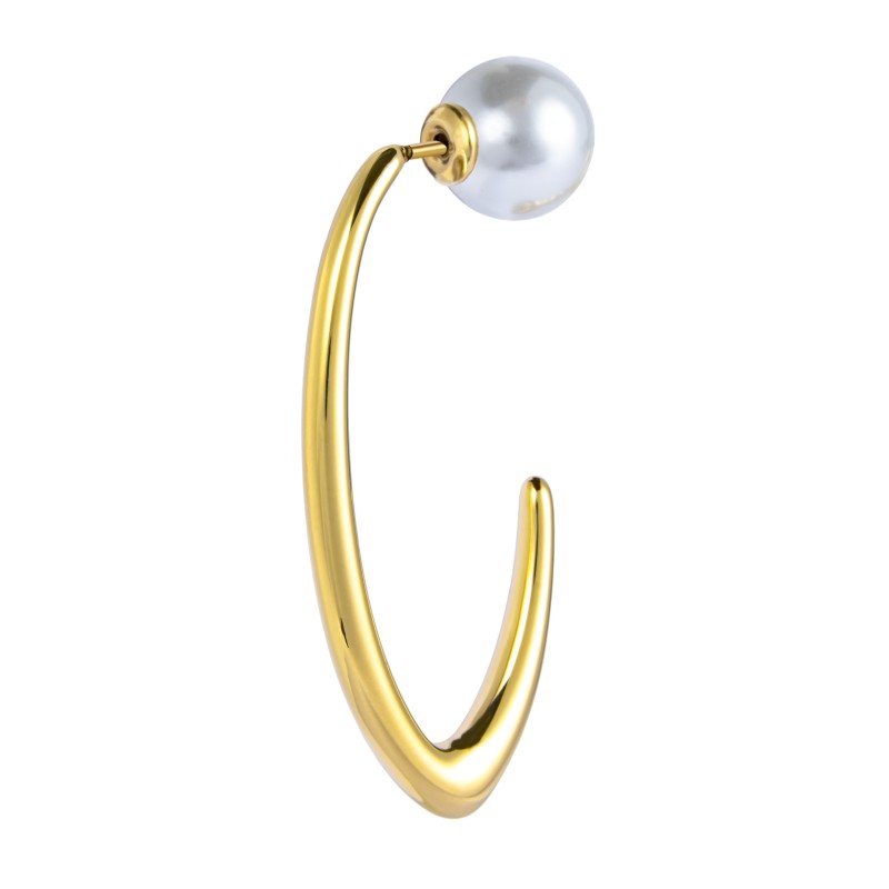Mono orecchino in acciaio ovale aperto, lunghezza 4 cm, con chiusura aggiuntiva perla a bottone di diametro 10 mm. Marlù logo laserato sul retro. Materiali: acciaio Pvd oro, perla