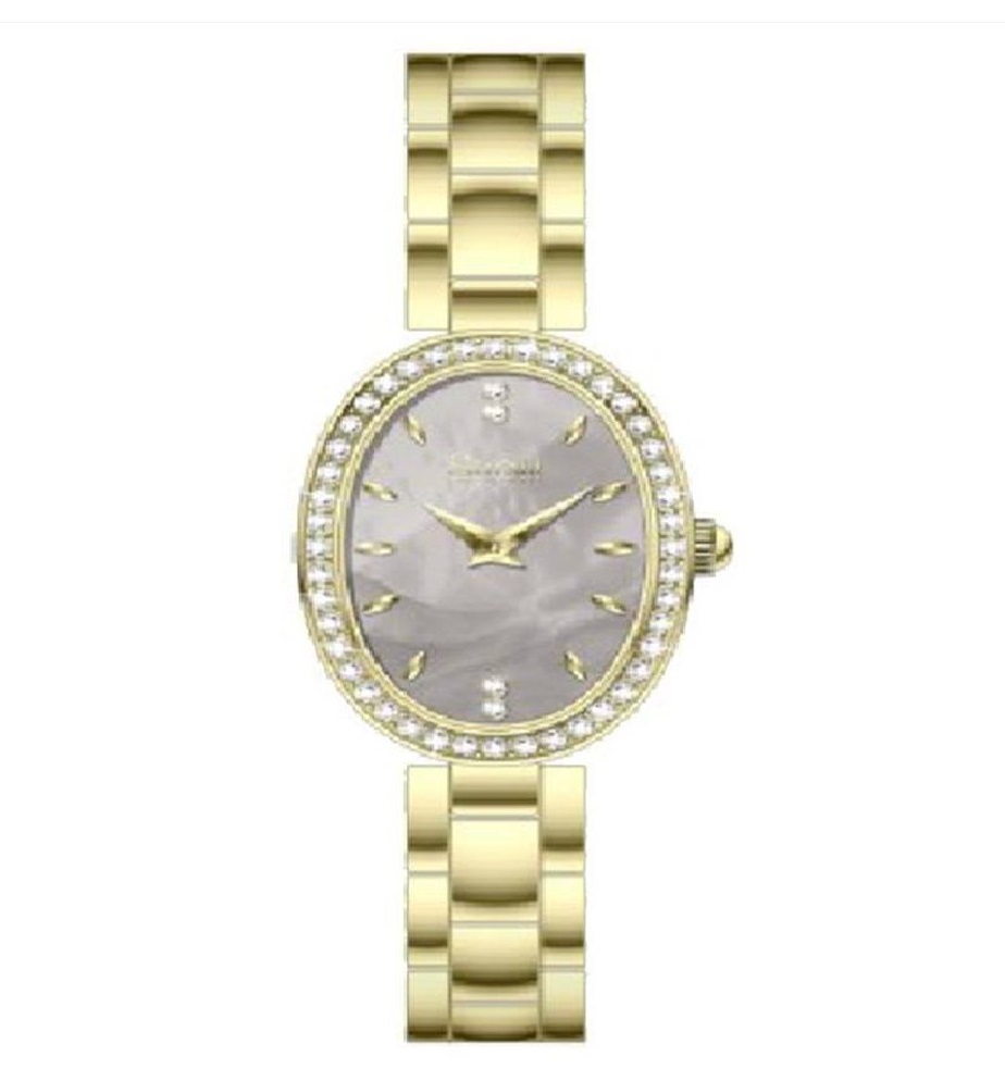 Quadrante: in madreperla grigia con indici, lancette dorate, strass e vetro minerale.
